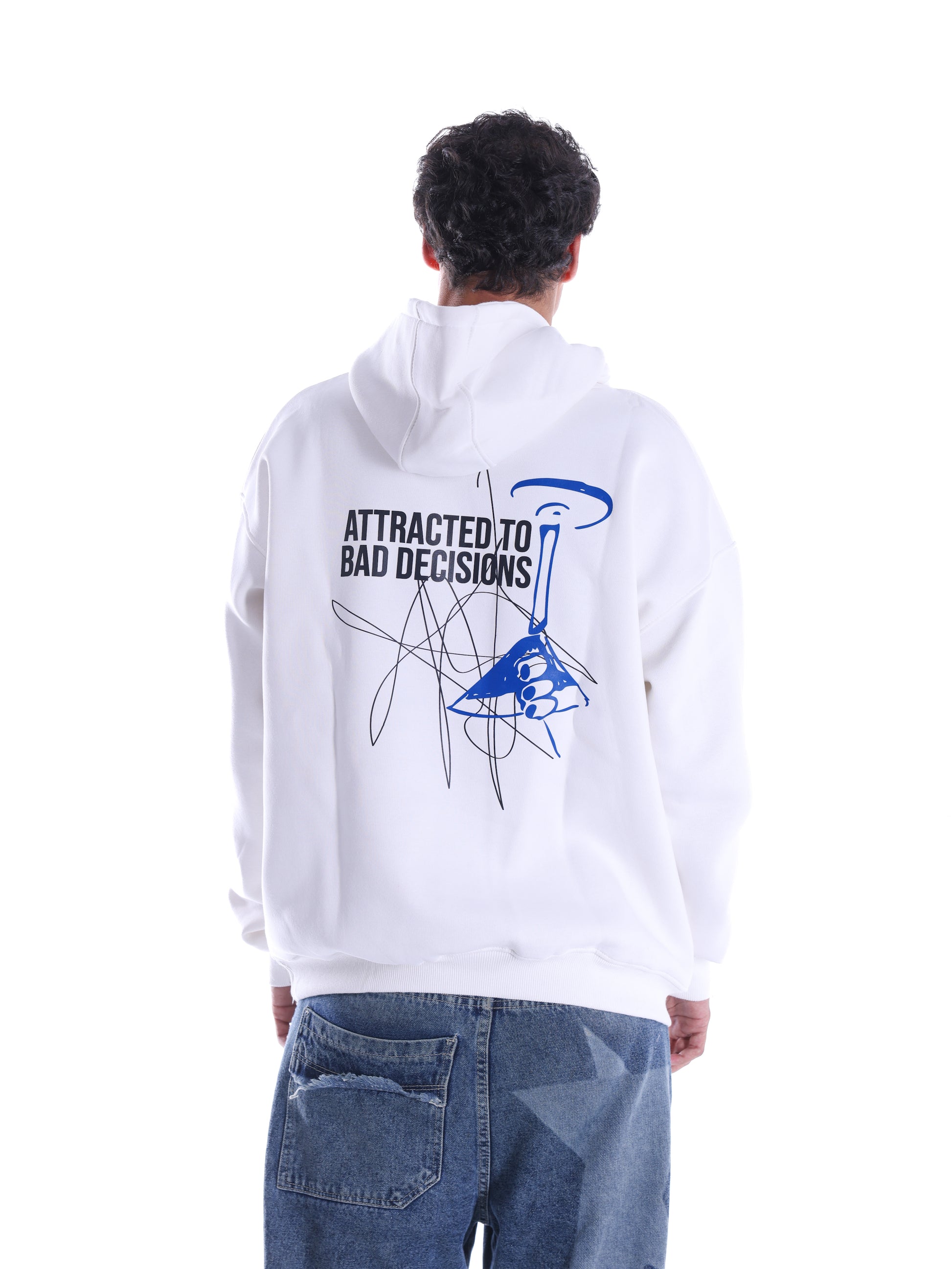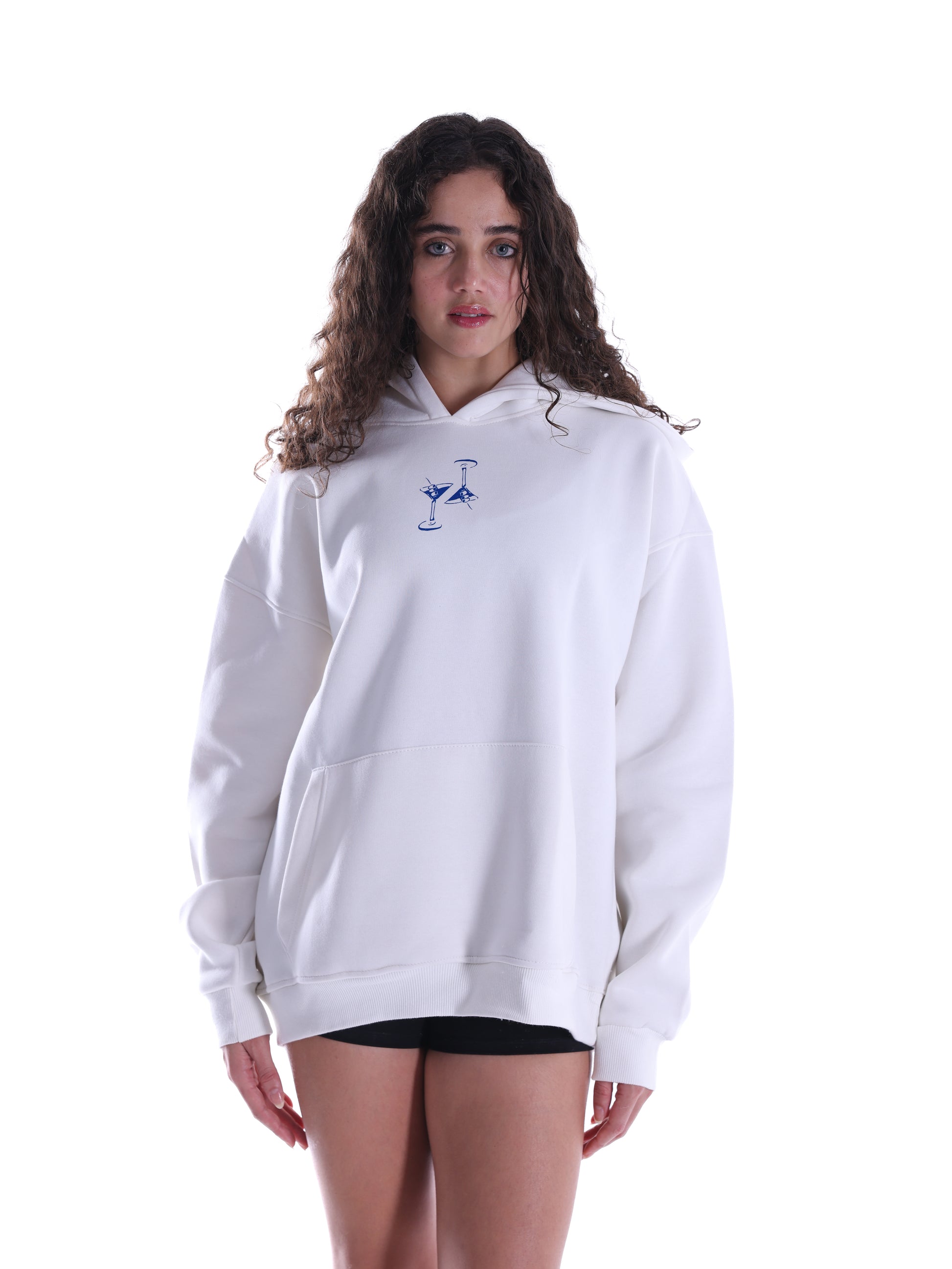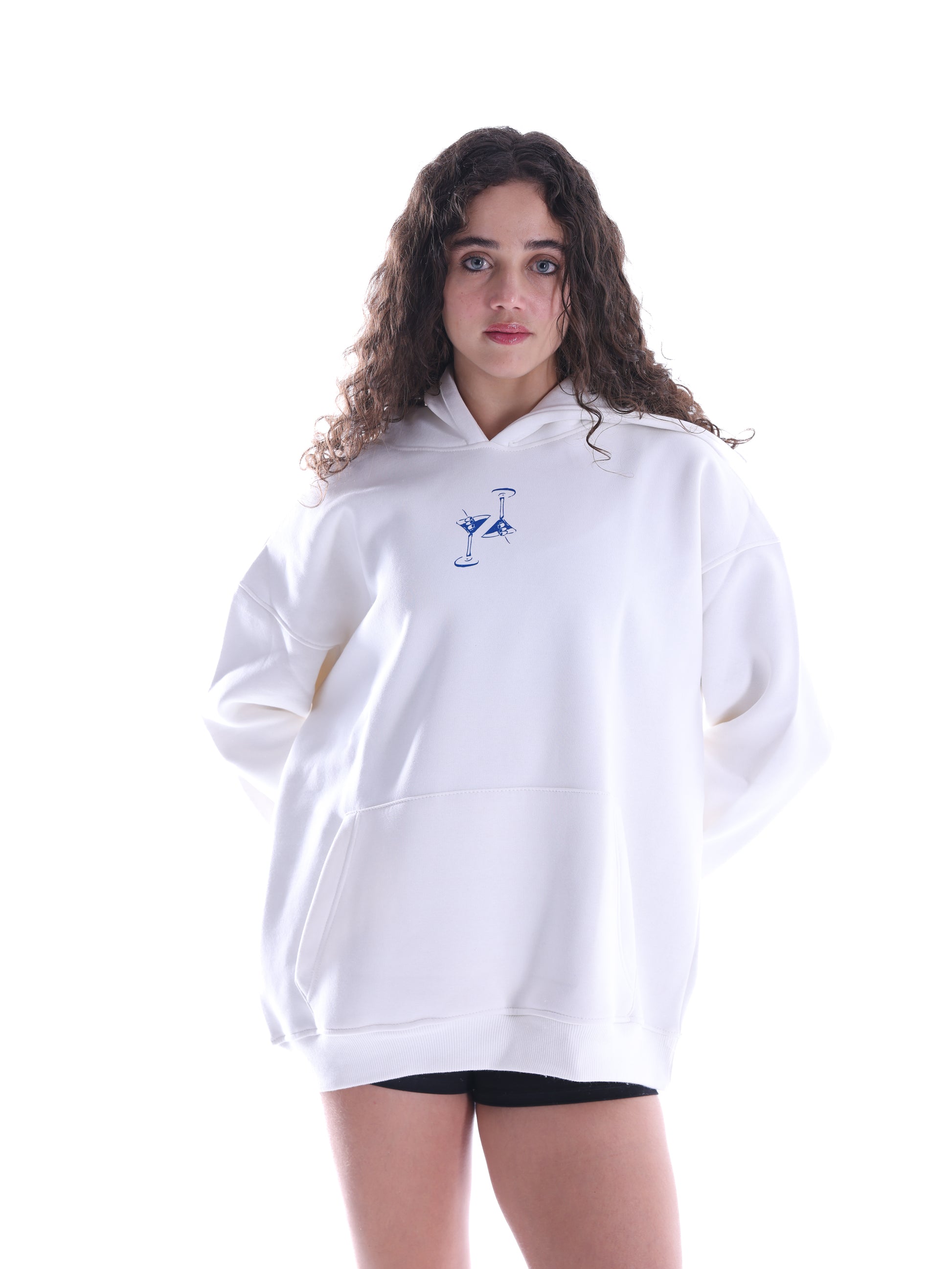 Soft white, oversized fit, with artwork that feels like a spill after midnight. A hoodie for late talks, cheap drinks, and getting away with things you’ll laugh about later.