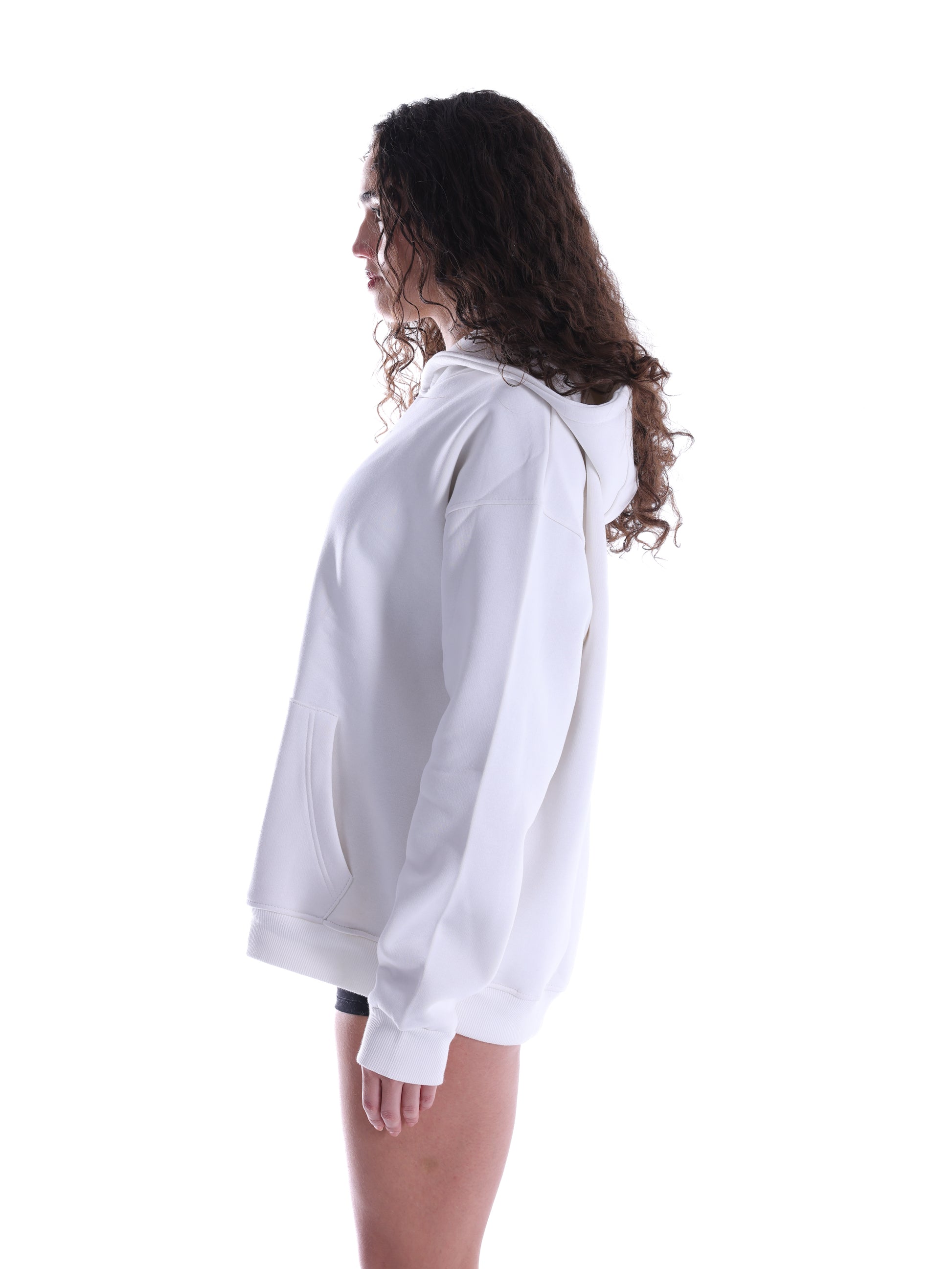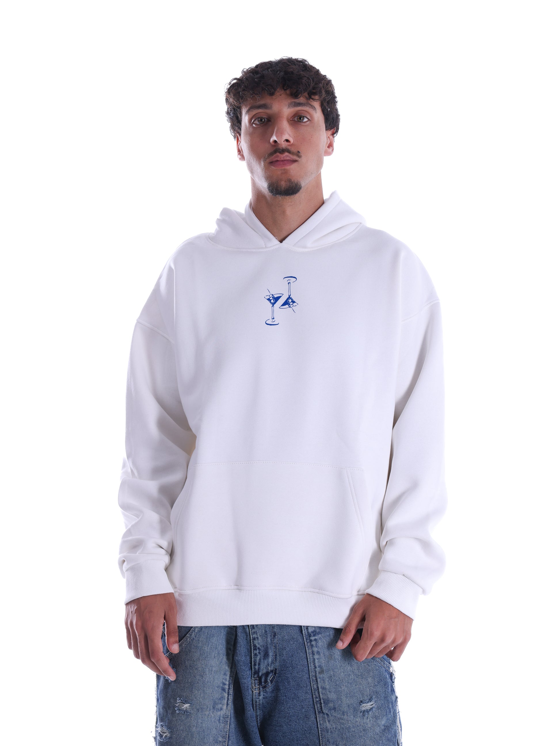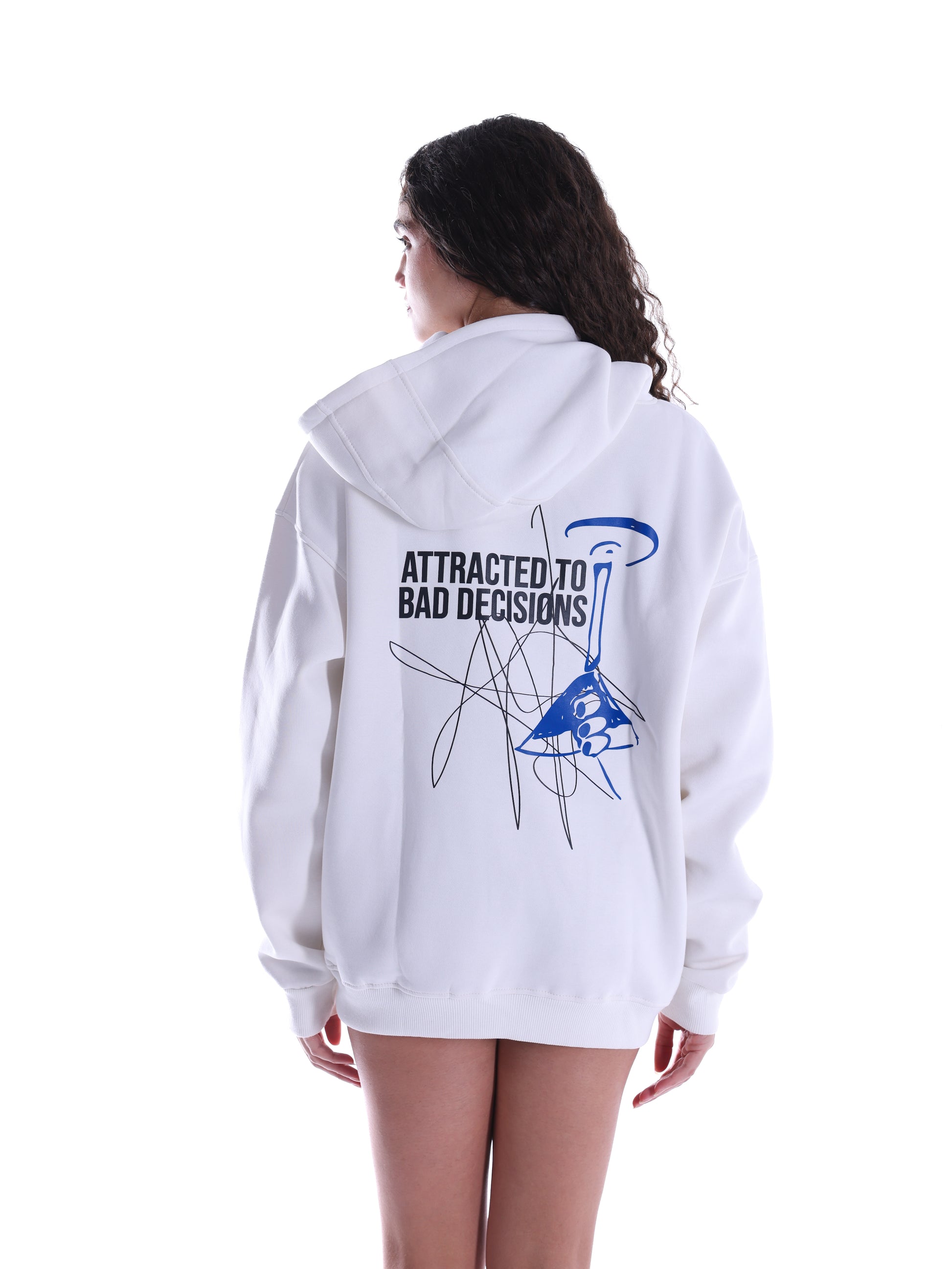 Soft white, oversized fit, with artwork that feels like a spill after midnight. A hoodie for late talks, cheap drinks, and getting away with things you’ll laugh about later.
